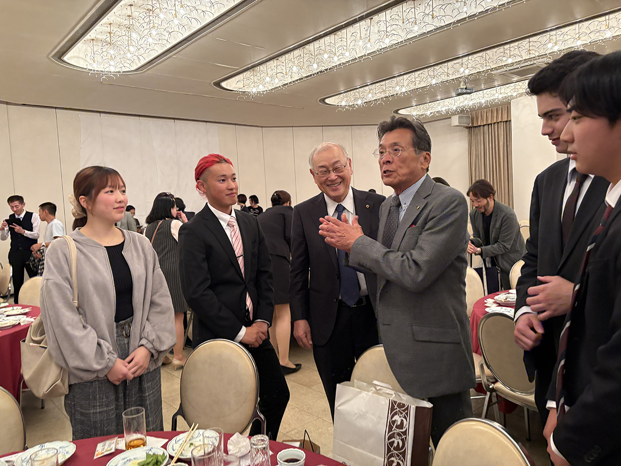 今年卒業した97回生と話す葉商会中村会長と永田副会長